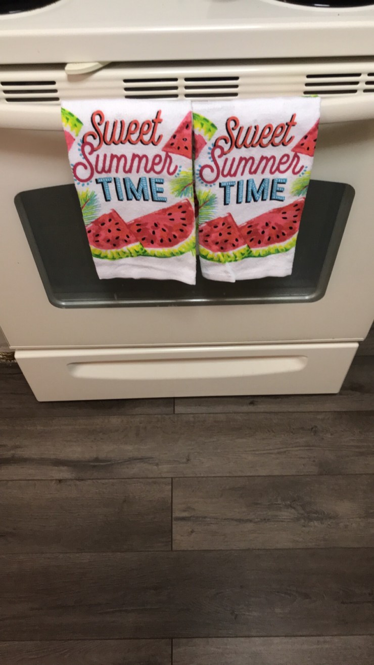 Tea towels(2), place mats (7), wash cloths (4), tall plastic tumblers (6), short plastic tumblers (6), a serving tray and a cute little pink caddy to match! It’s fun cheap ways you can forever change the look of your home!